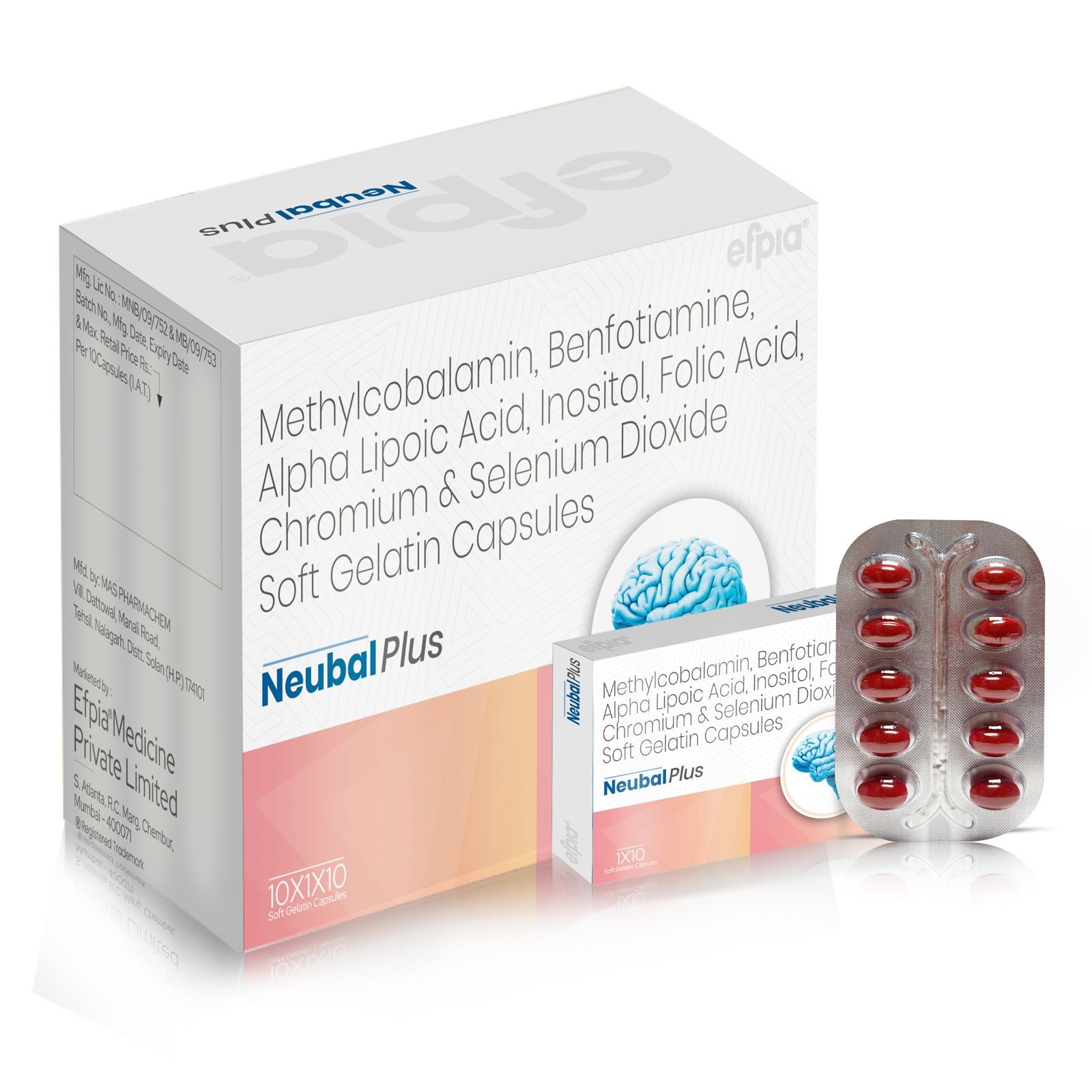 Neubal Plus Softgel capsules: The composition Methylcobalamin 1500mcg + Benfotiamine 150mg + Alpha Lipoic Acid 100mg + Inositol 100mg + Folic Acid 1.5 mg + Chromium Polynicotinate 200 mcg + Selenium Dioxide 55 mcg is a scientifically advanced combination of neuroprotective and metabolic nutrients formulated to restore, protect, and revitalise nerve health. Methylcobalamin promotes nerve regeneration and myelin sheath repair, effectively reducing neuropathic symptoms. Benfotiamine, a fat-soluble Vitamin B1 derivative, shields against diabetic complications and sustains healthy nerve conduction. Alpha Lipoic Acid, a potent antioxidant, alleviates oxidative stress, improves nerve conductivity, and relieves neuropathic pain. Inositol supports neurotransmission and balances nerve signalling pathways. Folic Acid facilitates DNA synthesis, red blood cell production, and energy metabolism. Chromium enhances insulin sensitivity, ensuring better glycemic control. Selenium provides immune support and robust protection against free-radical-induced nerve damage.